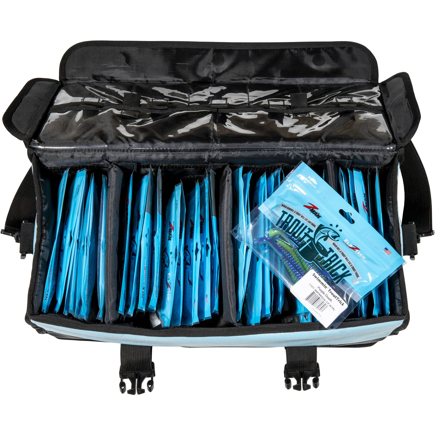 Constructed from durable 600 denier waterproof fabric, the oversized Bait LockerZ offers ample room to house over 50 packages of ElaZtech® softbaits. Adjustable dividers isolate bait types and file packages upright and securely. Top flaps with magnetic closures prevent lid from blowing open while locking water out. Interior clear storage compartments with hook-and-loop closures grant additional jighead, hook and lure storage. Exterior mesh pocket holds larger items like tools and leader spools. A rugged rubberized base prevents deck slippage. For easy transport, the Bait LockerZ features a lid handle and nylon shoulder strap.